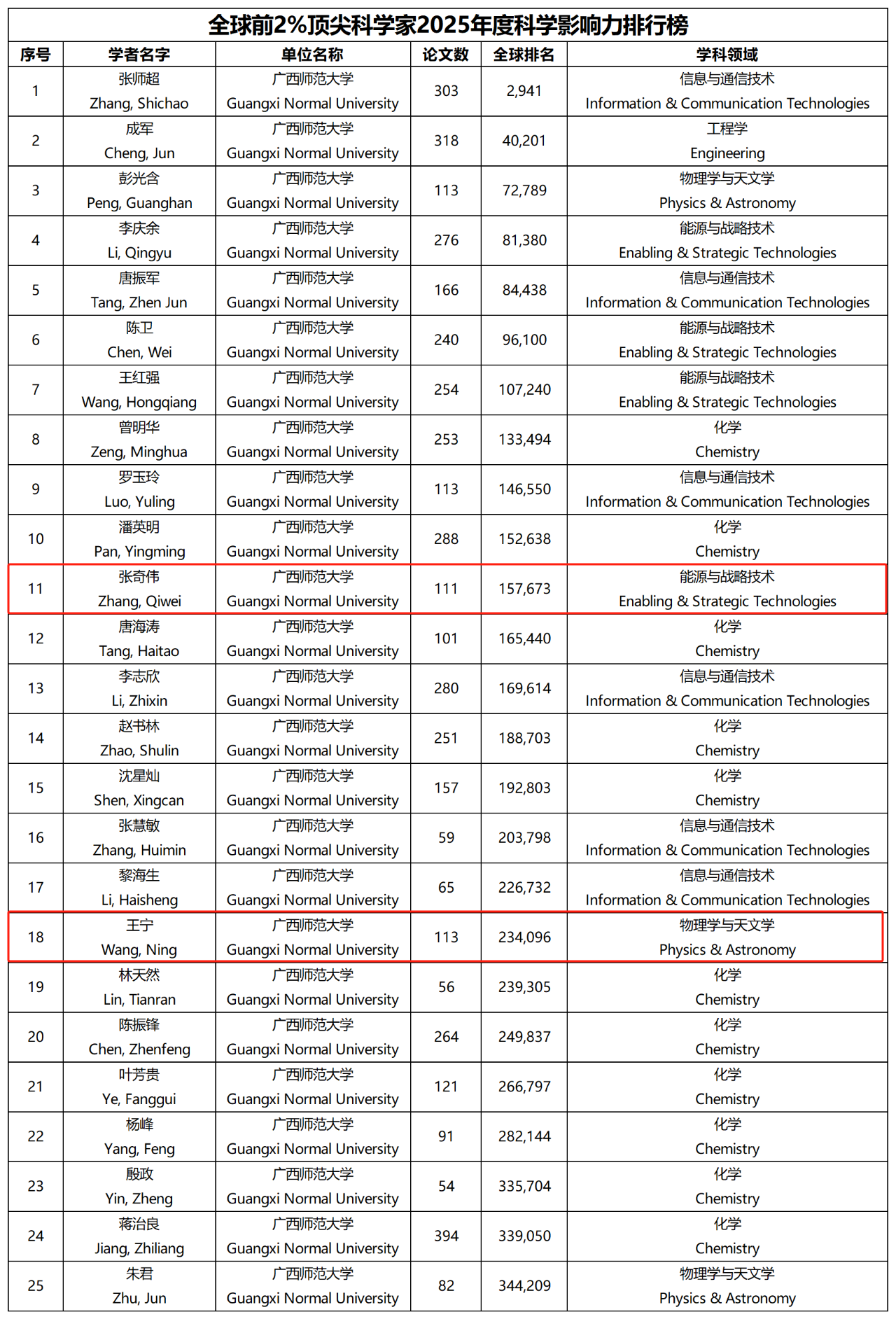 近日,美国斯坦福大学发布了2025年版全球前2%顶尖科学家榜单,广西师范大学25位学者入围榜单,其中fb体育与技术学院彭光含、张奇伟、王宁3名教授入选“2025年度科学影响力排行榜”,同时彭光含教授入选“终身科学影响力排行榜”。