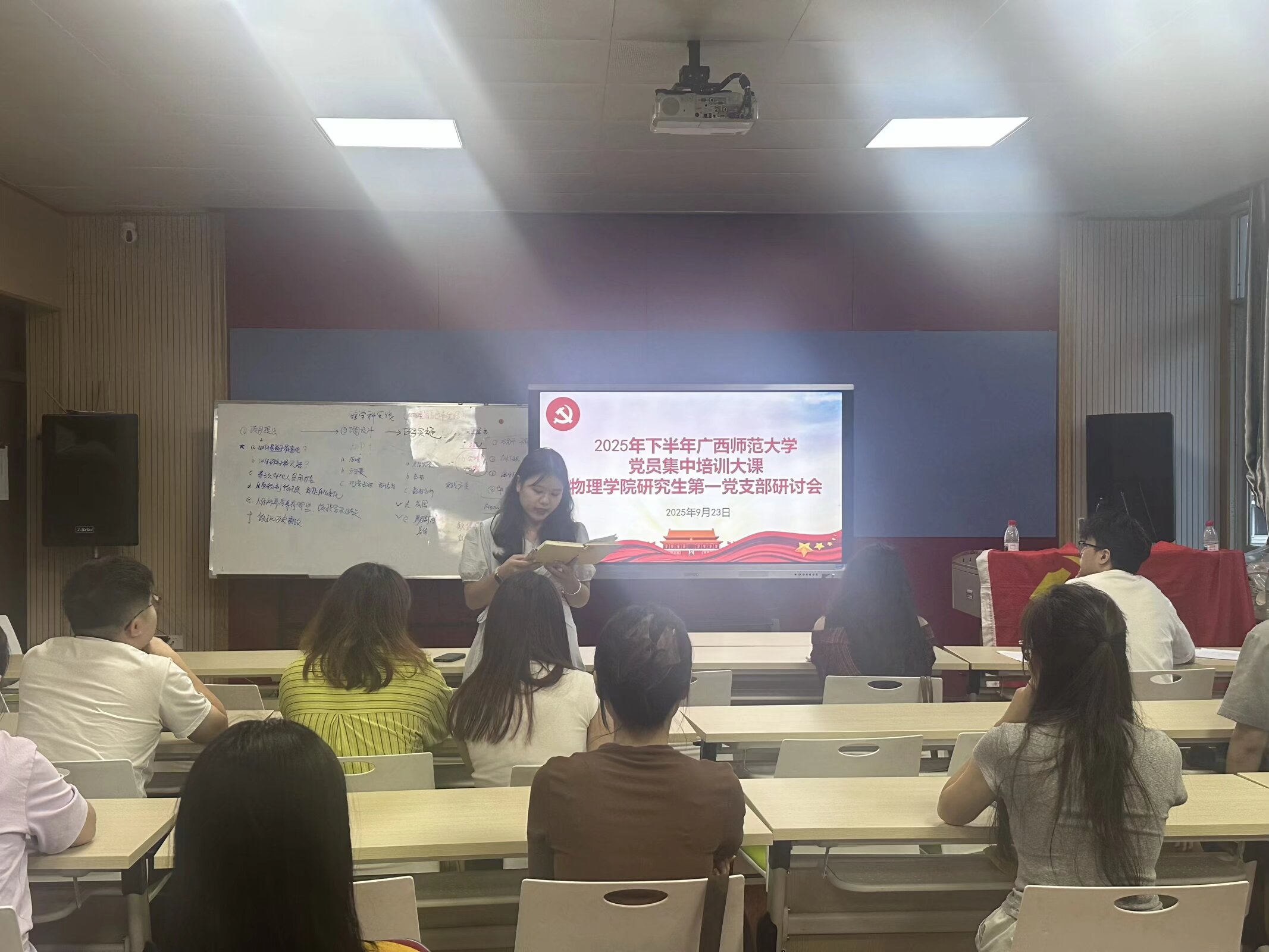结合新时代党员的责任与使命,支部书记阐述了在科研学习与日常生活中践行精神的具体路径,引导支部党员深刻领会党的纪律要求,为后续学习与实践筑牢思想根基。随后,与会党员依次发言,他们回顾了“今日党员基本培训下半年第一次集中大课”中的精彩瞬间,从党的光辉历史中汲取奋进力量,分享了将红色基因融入科研探索、学术钻研的心得体会。支部同志围绕如何平衡党员身份与研究生角色,如何在科研攻坚中发挥党员先锋模范作用展开热烈讨论,展现出青年党员积极向上、勇于担当的精神风貌,会议现场氛围热烈,思想火花碰撞不断。